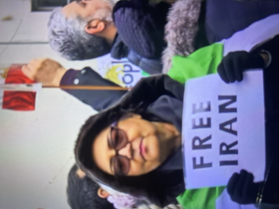 A woman wearing sunglasses and a hood holds a sign that reads "FREE IRAN