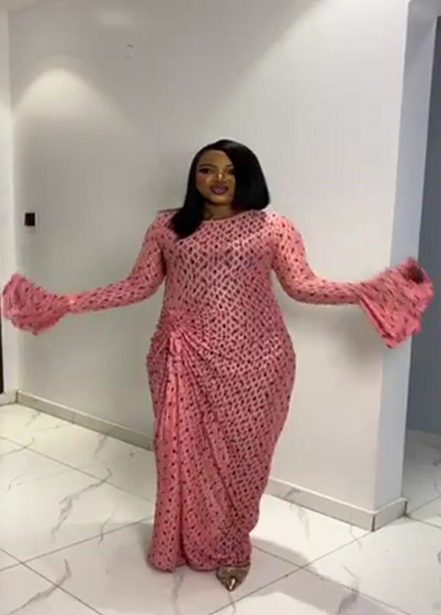 A medium shot shows a dark-skinned woman in a long-sleeved, pale-pink dress, standing in a room. The dress has a black pattern, a high neckline, and long bell sleeves. It is gathered and tied on the left side. She is wearing gold-colored pointed-toe heels. Her hair is black and cut in a chin-length bob, parted to the side. She is smiling, looking at the camera, and gesturing with her hands. The room has a white wall and marble-patterned tile floors. There is a light switch and a door frame visible to the left. The lighting is bright.