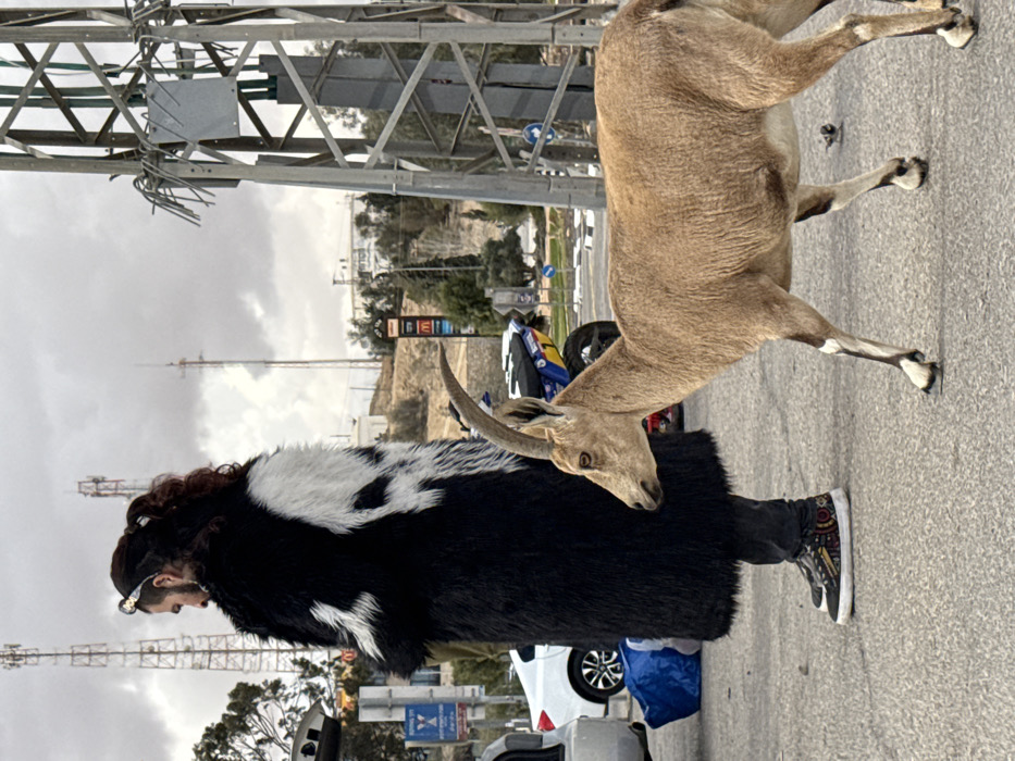 An outdoor scene in Mitzpe Ramon, Israel, depicts a human figure and a Nubian Ibex on an asphalt surface under an overcast sky