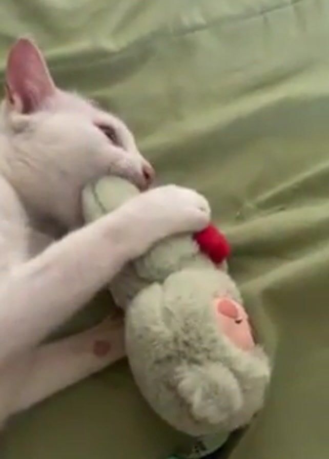 A close-up video shows a white cat lying on a green bed and gnawing on a light green plush toy