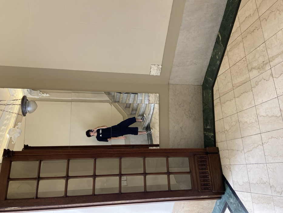 The image depicts an interior scene, likely a grand hallway or common area within an older building in Buenos Aires, Argentina, characterized by classic architectural details. **People:** One individual is visible, captured in a large wall mirror. This person, appearing young with dark hair, is wearing a black t-shirt with a white text logo, dark cropped trousers, and dark slip-on shoes. They are actively holding a smartphone to their face, indicating they are taking a selfie of their reflection. Their stance shows one foot casually placed on a reflected staircase step. **Objects and Environment:** * **Mirror:** A dominant feature, the mirror is composed of multiple rectangular panels, creating slight visual discontinuities. Two ornate, carved white decorative rosettes are affixed to its lower corners. * **Staircase (reflected):** Reflected within the mirror is a classic, light-colored stone staircase featuring a dark handrail and decorative newel posts or balusters. * **Door:** To the left, a tall, dark wooden door stands partially open. It features multiple clear glass panes (ten visible on the main panel) and ornate carved wood paneling at its base. * **Walls:** The upper walls are painted a light beige or cream. Below, a wainscoting is present, comprising light greyish-white marble panels, topped by a dark green marble strip, and then a lighter beige band. * **Floor:** The floor consists of light-colored square tiles with subtle, wavy grey veining. A border of dark green marble and a thin black line delineates the transition to the wall base. * **Ceiling/Molding:** The ceiling line features intricate white plaster moldings and decorative elements, consistent with classical architecture. A vintage-style light fixture, an inverted dome suspended by a chain, hangs from the ceiling. * **Wall Decor:** A single square, white carved decorative rosette is affixed to the right wall, below the mirror and above the marble wainscoting. **Actions:** The primary action is the individual taking a selfie, utilizing the reflective surface of the large wall mirror in the building's ornate interior. The overall environment suggests an elegant, well-maintained building with historical character, common in various upscale or historic neighborhoods of Buenos Aires.
