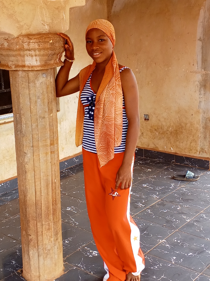 A young woman stands smiling in the city of Ankpa, Nigeria, against a light brown wall and a dark tiled floor. She is positioned to the left of a weathered, light brown concrete pillar, her left hand resting on its capital. She wears an orange headscarf, a blue and white striped sleeveless top with a dark blue and white polka dot bow, and an orange patterned scarf draped over her shoulders. Her lower attire consists of orange track pants featuring white side stripes and embroidered stars. A light-colored bracelet is visible on her left wrist. On the floor to her right, a pair of black and green sandals are present. The wall behind her appears aged, with a rectangular dark opening or window frame visible to her left, and a small dark object affixed to the wall behind her right shoulder.