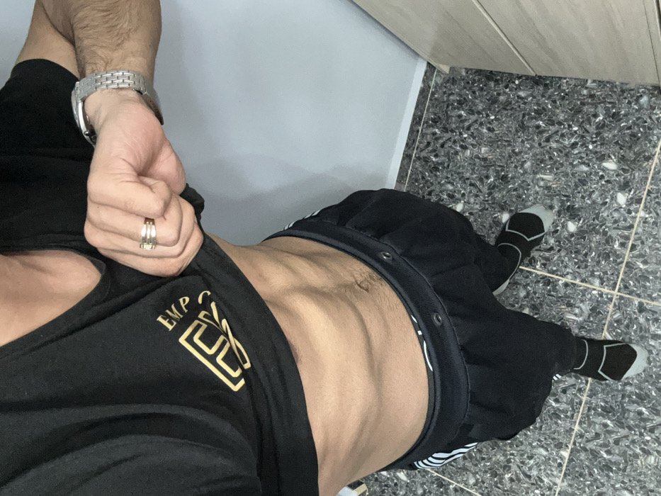An indoor scene in Lyuben Karavelovo, Bulgaria, depicts a male individual from the upper chest to the feet, standing on a speckled dark grey tiled floor. The subject wears a black t-shirt with a gold "EMPO" graphic, black athletic pants with white side stripes, and black and grey socks. The right hand is positioned to lift the t-shirt, exposing a muscular abdomen with visible definition and light body hair around the navel. A two-tone ring is worn on the right ring finger, and a silver-colored metallic watch with a link bracelet is on the right wrist. The background consists of a plain light grey wall and a partial view of a light-colored wooden cabinet on the right.