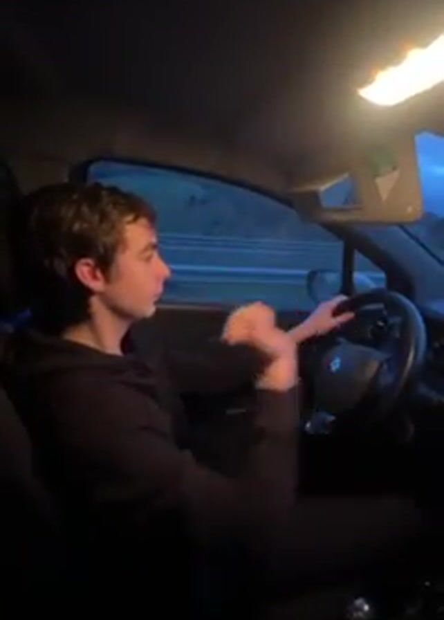 young man driving a car at night. He is wearing a dark sweatshirt and pants. He is moving his hands as if drumming in time to the music. The interior of the car is visible, including the dashboard, steering wheel, and passenger seat. Through the window, you can see the road and some trees in the distance. The lighting is dim inside the car, with only the overhead light providing illumination.