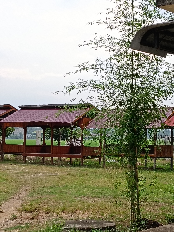 The image depicts an outdoor scene in Blangkutacoh, Indonesia, featuring a series of unoccupied wooden gazebos, an unkempt grassy field, and agricultural land under an overcast sky