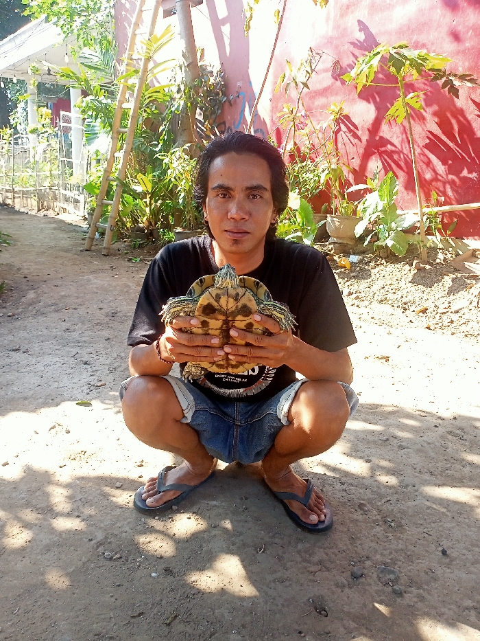 A male individual is observed in an outdoor setting in Ketowan, Indonesia, crouching on unpaved ground under direct sunlight. The man, with dark, shoulder-length hair and a light complexion, wears a black short-sleeved t-shirt with partially visible white text, blue denim shorts rolled above the knee, and dark flip-flops. He is holding a small, patterned turtle, likely a pond turtle species, with both hands, presenting its plastron (underside shell) towards the camera. The turtle's head is extended, facing forward. The man maintains direct eye contact with the camera. The environment includes packed dirt and gravel ground with scattered small stones and debris, marked by sharp shadows from an overhead light source. To the left, an unpaved path is visible alongside a rudimentary wooden fence. Further back on the left, a white-roofed structure with string lights is present, surrounded by various green foliage and a tall bamboo-like support pole. To the right, a prominent red-painted wall serves as a backdrop for several potted plants and wild vegetation, including a small papaya tree with variegated leaves. Shadows from plants are distinctly cast upon the red wall.