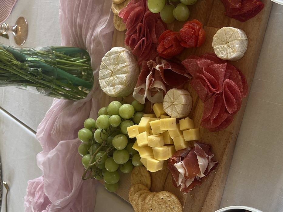 This image, reportedly captured in Santa Ana Yancuitlalpan (Chilhuacán), Mexico, presents a high-angle view of a charcuterie board positioned on a light-colored table surface. The wooden board is densely covered with various foodstuffs. In the upper left quadrant of the board, a substantial cluster of green grapes is visible. Below this, a pile of approximately 40-50 yellow, uniformly cubed cheese pieces occupies the center-left. To the immediate left of the cubed cheese, a stack of round, plain crackers is partially visible, extending slightly off the frame. Below the cubed cheese, a group of irregularly folded, thinly sliced pieces of reddish-brown cured ham is arranged. Moving towards the right, a small, round wheel of white, soft cheese with a scored top is situated. Adjacent to this, a cluster of thin, circular slices of reddish-pink salami is fanned out. Further to the right, two red, rose-shaped items, consistent with dried tomatoes or carved red bell peppers, are visible, next to a smaller cluster of green grapes. In the upper right quadrant of the board, another larger, round wheel of white, soft cheese with a scored top is present, beside a more compact grouping of folded reddish-pink salami slices. The background reveals a light pink, sheer fabric, possibly a runner or overlay, draped loosely across the table surface. Behind the charcuterie board, a clear glass vase containing multiple green-stemmed plants or flowers with their bases submerged in water is visible. A portion of a gold-tinted stemmed glass is discernible in the upper right background. A metallic, gold-colored utensil is partially present in the far upper left background. A segment of a white, ceramic bowl is visible in the lower left corner of the frame. No individuals are depicted, and no direct actions are observed. The scene is a static arrangement of food and table settings.