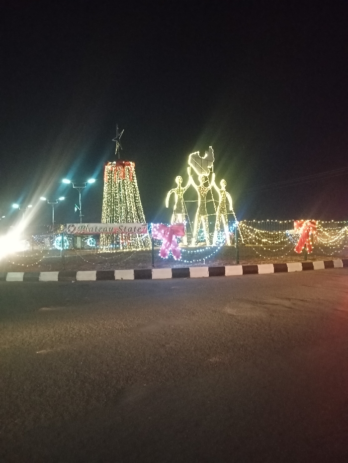 A nighttime shot captures a brightly lit roundabout adorned with festive decorations