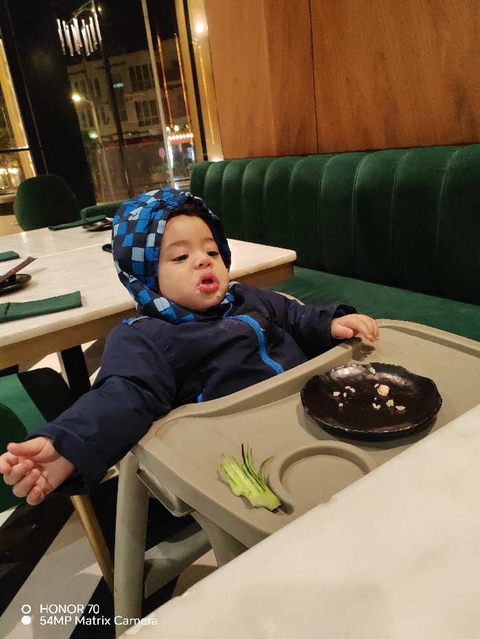 A baby in a blue hooded jacket sits in a highchair with a gray tray. A small, dark plate holds food remnants. Sliced cucumber decorates the tray. The baby has food around their mouth. The background reveals a restaurant setting with green cushioned seating and a table with dark green placemats. A window behind the baby shows building lights.