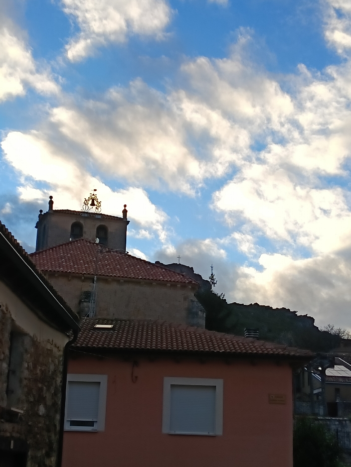The image depicts an elevated view of architectural elements within the city of Montorio, Spain, under a partly cloudy sky. In the foreground, a reddish-orange building with a terracotta-tiled roof is visible, featuring two rectangular windows fitted with closed white roller shutters. To its immediate left, a portion of a stone-clad building is partially visible. Directly behind and slightly to the left of the reddish-orange building, an older, light-colored stone structure with a red tiled roof is present, which appears to be part of a larger building, possibly a church. This structure is topped by a bell tower, featuring a golden bell encased in decorative black wrought ironwork and flanked by two finials. Further in the background, a steep, rocky hillside covered with sparse vegetation rises, crowned by a prominent black cross at its summit. The sky occupies the upper two-thirds of the frame, displaying patches of clear blue interspersed with numerous white and grey cumulus and stratocumulus clouds, suggesting an overcast but bright daylight condition. No individuals or explicit actions are visible within the scene.