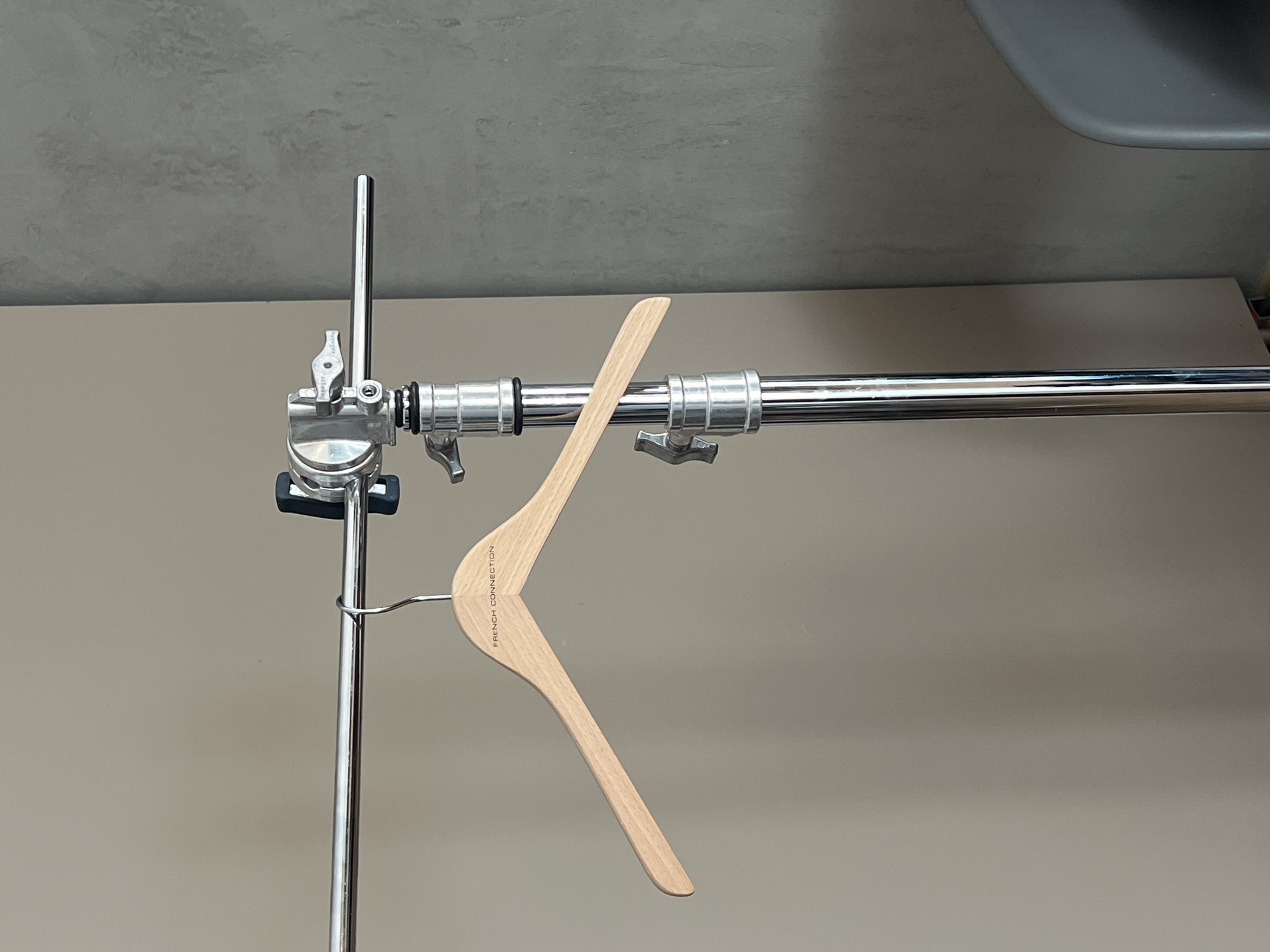 The image displays an interior space within Sofia, Bulgaria; the specific location within the city cannot be determined from the visual information. No individuals are present. A light-toned wooden clothes hanger, inscribed with "FRENCH CONNECTION" in dark capital letters, hangs by its silver metallic hook from a horizontal chrome rod positioned in the upper center of the frame. This rod is secured to a multi-segmented chrome C-stand or light stand, visible on the right side of the image, featuring several adjustment clamps and locking knobs. The background consists of two distinct wall surfaces: a plain, light beige or taupe wall on the left and center, and a darker, textured grey wall or backdrop on the right. A curved, dark grey object, consistent with the back or armrest of a chair, is partially visible in the bottom right corner.