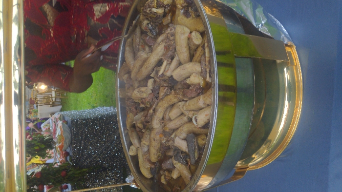 The image depicts an outdoor catering setup at an event in Kondeni, Tanzania. In the foreground, a large, rectangular chafing dish, constructed from polished stainless steel and brass, sits on a table covered by a dark blue tablecloth. The chafing dish contains a steaming stew consisting of numerous elongated, light-colored pieces, consistent with cooked bananas or plantains, mixed with darker, irregular cuts of meat or organ meat. A person, clad in a red patterned garment, is partially visible on the right, with their right arm extended over the chafing dish, holding a serving utensil, indicating the act of serving or preparing to serve food. The background reveals an outdoor setting characterized by green grass. To the left, another buffet table draped with a shimmering silver sequined tablecloth holds various serving bowls, likely containing salads or fruit, and is decorated with green foliage bearing red fruits. Further in the background, additional tables covered with white tablecloths and paired with gold-colored chairs are visible, along with blurry figures of other individuals. A decorative light fixture or lantern is discernible in the distant right background.