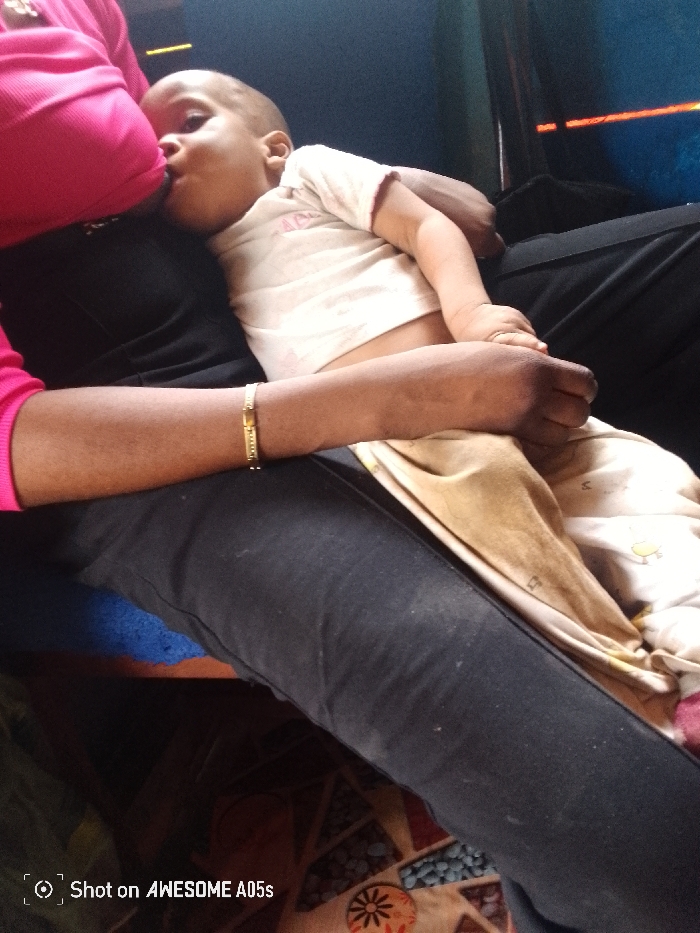 An adult, partially visible, wearing a bright pink top and dark pants, is seated. A gold-colored bracelet is on the adult's left wrist. An infant, with a light complexion and bald head, wearing a light-colored top and patterned bottoms, is positioned to breastfeed from the adult's exposed left breast. The infant's left hand rests on the adult's left forearm. A blue cushion is visible beneath the adult's right thigh. The background features what appears to be a screen displaying blue and orange hues, along with a patterned floor or rug featuring geometric shapes and a cluster of small blue-green objects. The scene is located indoors, in the city of Unknown, Unknown.