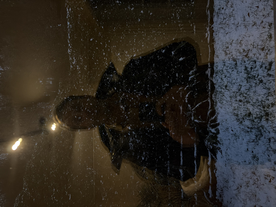 A person wearing a black jacket and light-colored pants is reflected in a rain-streaked window. The reflection is blurry, and snow appears to be falling outside. A light source is visible on the left side of the image. The right side of the image reveals snow-covered ground and grass. The scene suggests a cold, wet, winter day.