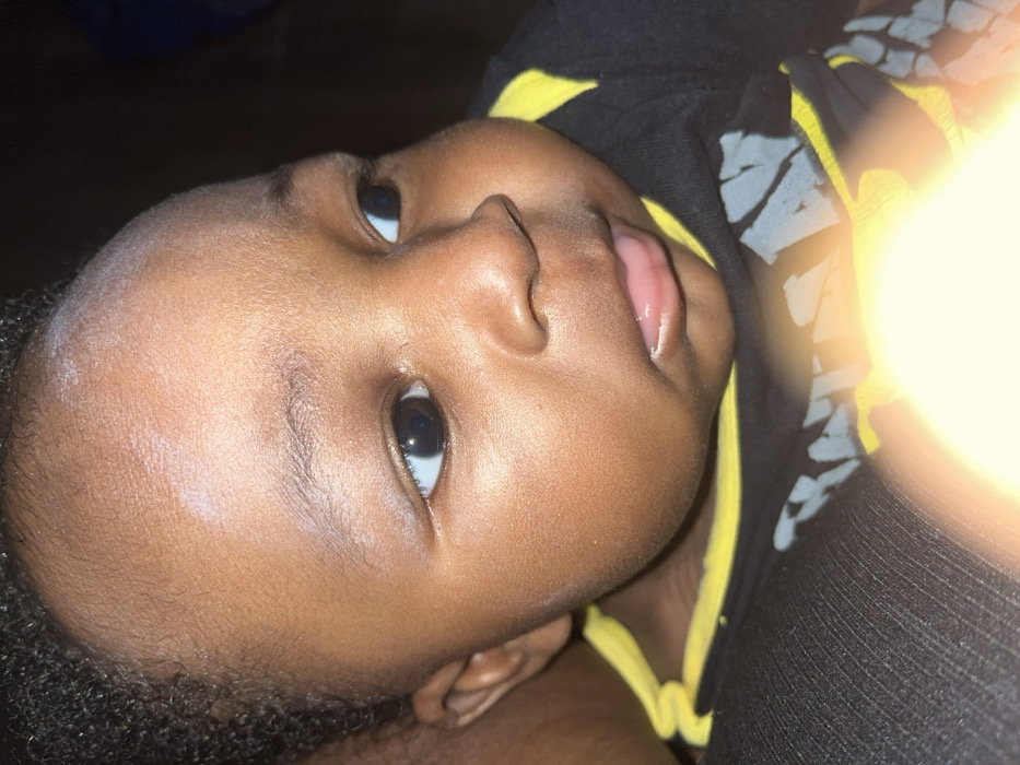 A close-up, chest-up portrait depicts an infant with dark skin, dark curly hair, and dark eyes