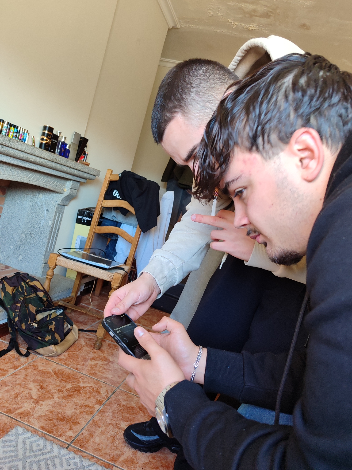 Two young adult males are depicted indoors in an unspecified location. The subject in the foreground, right, has dark, styled hair and stubble. He is wearing a dark hooded top, a silver-colored chain bracelet on his left wrist, and a watch on his right wrist. He holds a black smartphone horizontally with both hands, viewing its screen. The smartphone screen displays text in Portuguese, including "Vamos conhecer o que é você" and the time "10:01". The second subject, in the background, left, has a closely cropped haircut and wears a light-colored hooded top. His left hand is extended, with the index finger pointing towards the smartphone screen, indicating shared attention and interaction regarding the device's content. The immediate environment includes a terracotta-tiled floor, with a section of a light-colored rug visible in the lower left. A camouflage-patterned backpack rests on the floor in the lower left. To the left of the subjects, a stone or concrete fireplace mantelpiece holds an assortment of objects, including multiple small bottles (likely perfumes) and various colored cigarette lighters. A rustic wooden chair with a woven seat is positioned near the fireplace; it holds a dark-colored tablet or laptop on its seat and has clothing draped over its back, including a black t-shirt. Behind the chair, a black box marked "ELECTRONIA" is visible. The walls are light-colored, and a ceiling section in the upper right shows some texture. Natural light illuminates the scene from an unseen source to the right.