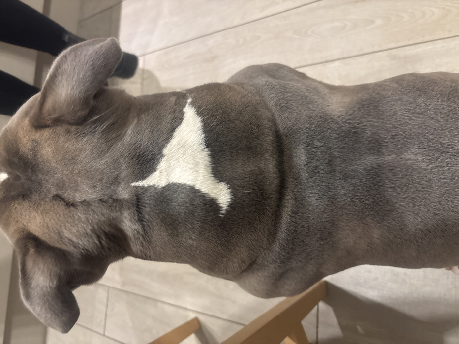 A top-down shot reveals a gray, muscular dog. Its head and part of its body are visible, showing short fur. A distinct white, triangular patch is present on its back, near its head. The dog appears to be standing on a light-colored, wood-grain tiled floor. The leg of an individual wearing black pants is seen in the upper left corner. A wooden chair leg is visible near the dog's body.