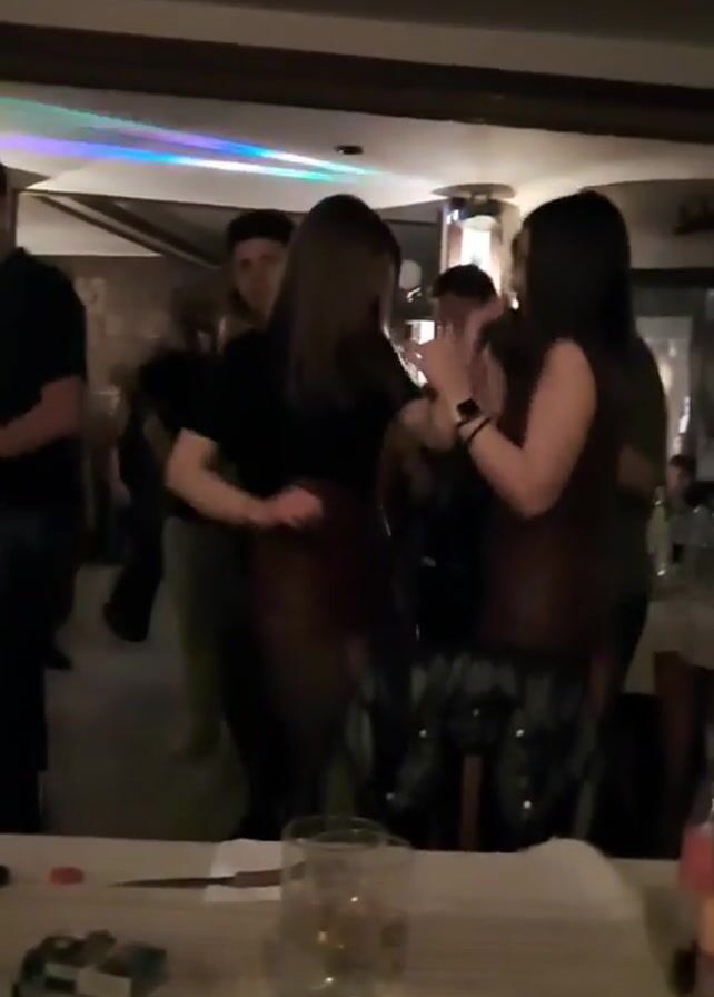 dimly lit restaurant or bar with people dancing. Several individuals, including two women in the foreground, are moving to the music, while others stand around or pass by. The women are dressed in casual clothing. In the background, more people are visible, some standing and others walking through a doorway. Tables with glassware and other items are visible in the foreground, suggesting a dining area. There are laser lighting effects on the ceiling.