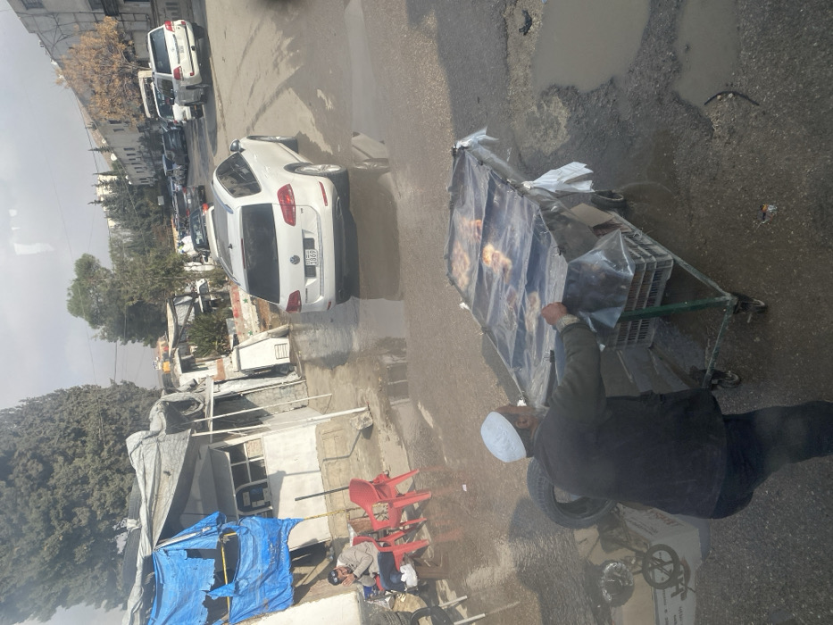 The image depicts a street scene in Dahiyat Harasta, Syria, under daytime lighting conditions. In the foreground, a male individual wearing a white kufi and a dark jacket is seen from behind, pushing a four-wheeled metal cart across a wet, pothole-damaged asphalt road. The cart is loaded with white plastic crates, covered by a clear plastic sheet beneath which baked goods are visible. A black tire is attached to the side of the cart. To the left, a makeshift structure constructed from light-colored building materials, corrugated metal, and blue tarpaulins is present. A second male individual, wearing a grey hooded sweatshirt and dark sunglasses, sits on a red plastic chair outside this structure, appearing to be using a mobile phone. Additional red plastic chairs are visible nearby. In the midground, a white Volkswagen Touareg SUV, with Syrian license plate "1869," faces away from the viewer on the wet road, reflecting parts of the environment in puddles. Further down the street, multiple other vehicles, including a white Toyota Land Cruiser, are visible, parked or in motion. The street itself exhibits numerous puddles and visible wear. The background features a mix of green conifer trees, some bare deciduous trees, and concrete buildings consistent with an urban or semi-urban setting. The overall environment suggests a bustling street with ongoing activity.