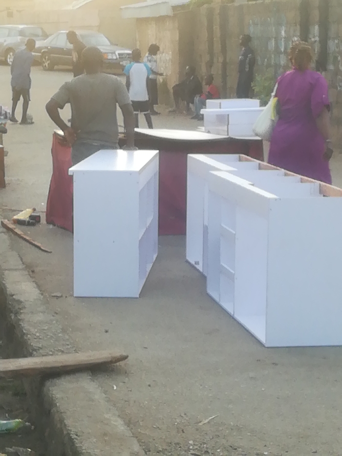 An outdoor scene reveals several individuals engaged in various activities. In the foreground, two unadorned white display cabinets with visible shelving are positioned on a concrete surface. Several people stand in the background and a car is parked at the distance. A woman dressed in purple walks towards the right side of the image. A man wearing a gray shirt stands and appears to be looking at the white display cabinets.