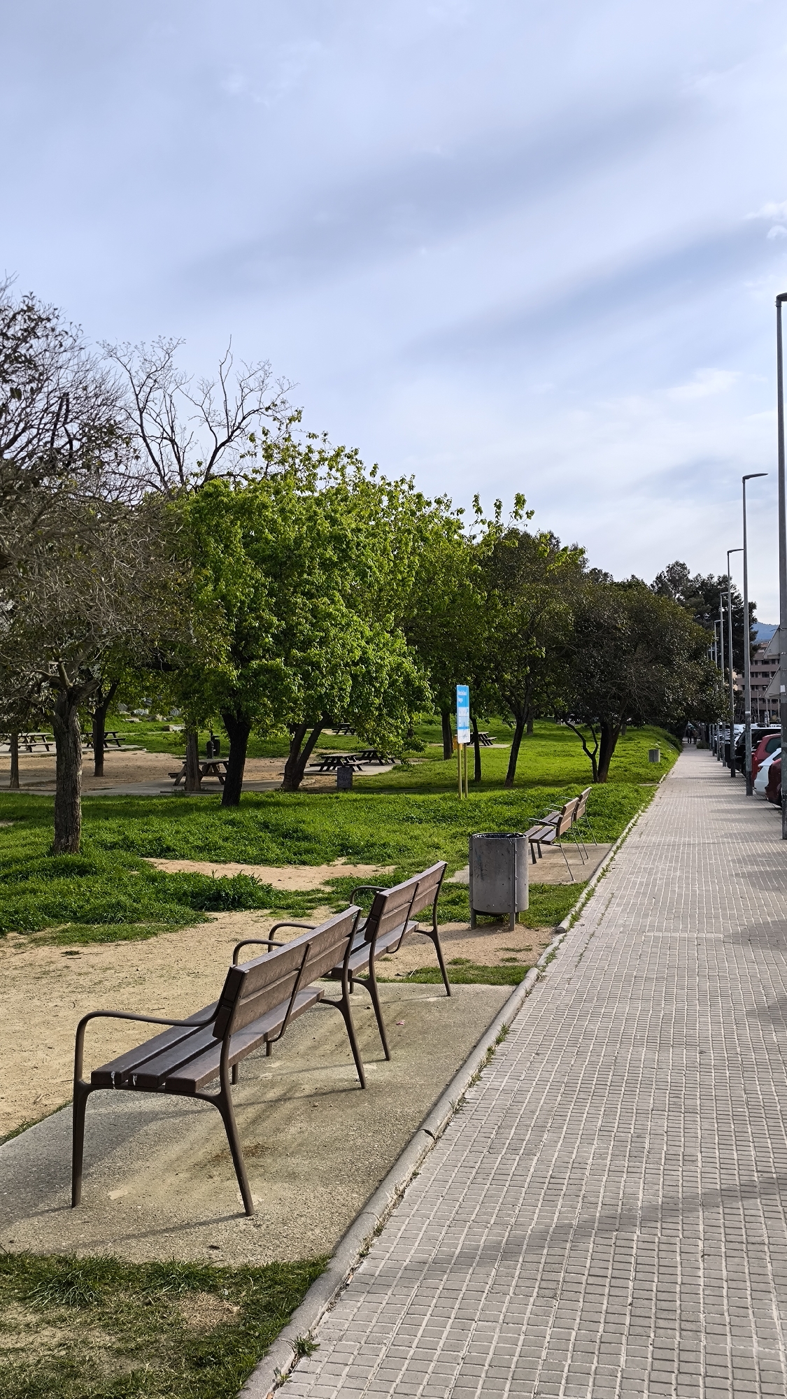 The image captures a public park area in Ripollet, Spain, on a day with overcast skies. The scene features a paved walkway composed of square grey tiles, running alongside a grassy area with several trees. In the foreground, three park benches made of dark wood and metal frames are arranged parallel to the walkway. A grey trash bin is situated between the benches. In the grassy area, several picnic tables can be seen beneath the trees, suggesting a recreational or leisure space. The paved walkway extends into the distance, lined with street lights and parked cars on the right side. The background includes buildings and additional trees, creating a typical urban park setting. No people are prominently visible in the foreground, though blurred figures can be seen sitting at some picnic tables in the distance.