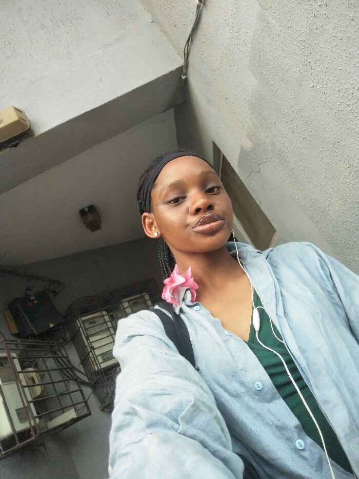 A young female is depicted in a close-up, chest-up selfie format, positioned in an outdoor or semi-outdoor urban setting in Iranla, Nigeria