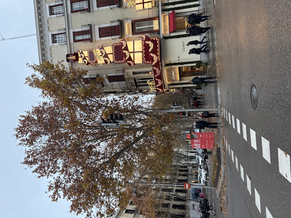 A street scene depicts a Cartier store adorned with Christmas decorations. Pedestrians walk by the store. A large tree with autumn foliage stands on the sidewalk. Traffic lights are visible along the street with a crosswalk. Cars are parked and driving along the road. The sky is overcast.