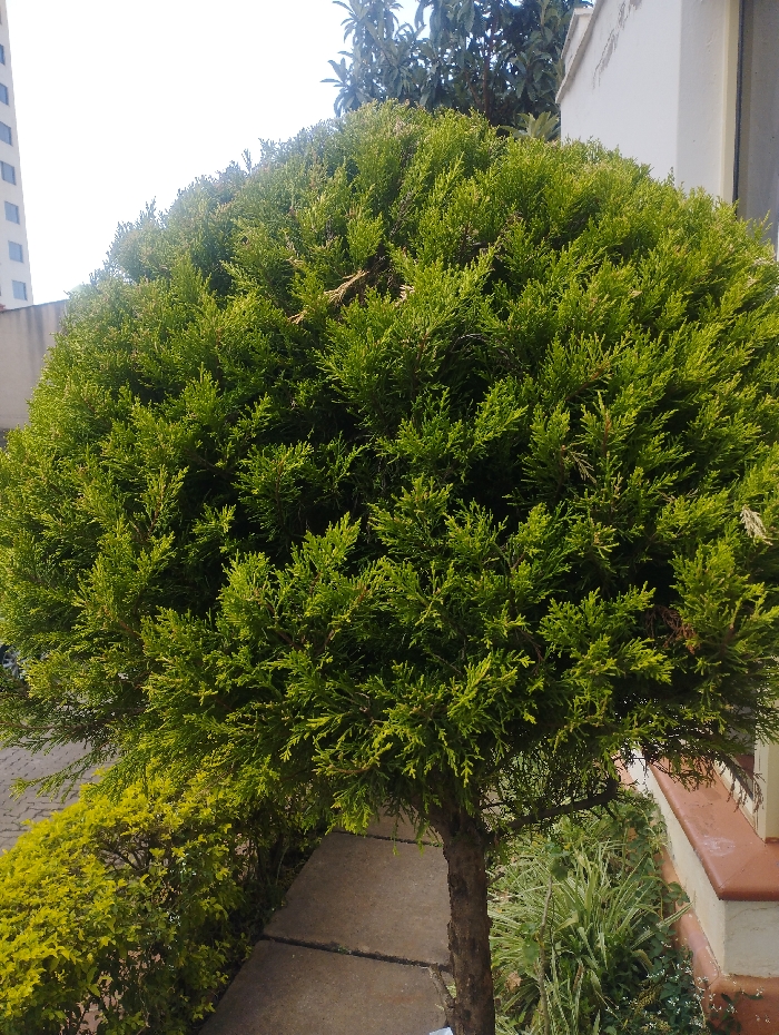 The image displays an outdoor urban or suburban scene in Nairobi, Kenya, under bright daylight. The central subject is a large, densely foliated, spherical coniferous shrub or small tree with vibrant green leaves, positioned in the mid-ground. Its brown trunk is visible at the base. To the left of this plant, a narrow, grey concrete pathway, composed of square slabs, extends diagonally towards the upper left. Adjacent to the path on the left is a low, dense hedge with bright chartreuse-colored foliage. To the right of the main plant, near a building, are several thin, variegated ornamental grasses. The right side of the frame features a segment of a light-colored building (white or off-white) with a terra cotta colored ledge or base molding. In the upper left background, a portion of a tall, multi-story building with a grid pattern of windows is discernible. Behind the main plant and the building on the right, a darker green tree with more irregular foliage is visible against a bright, overcast sky. No individuals or active subjects are present in the scene.