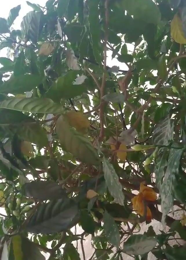 plant with green leaves and some yellow or brown leaves mixed in. The branches are thin and visible between the leaves. The plant is likely in a pot, as a red or brown container is partially visible at the bottom left. The background is a light-colored wall and a bright, overcast sky.
