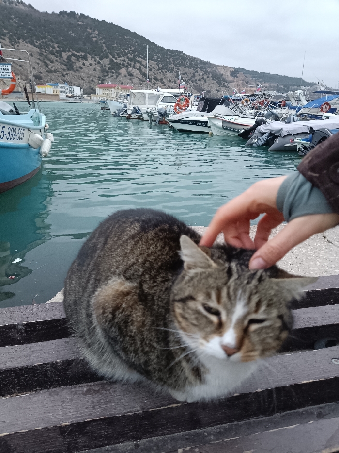 A cat sits on a wooden bench near a harbor filled with boats, its eyes nearly closed as a hand gently strokes its head. The feline is a mix of brown and white fur, appearing relaxed and content. In the background, turquoise water stretches to meet a hilly landscape under an overcast sky. Several boats are docked in the harbor. The setting appears tranquil.