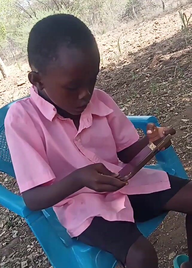 A young, dark-skinned person wearing a pink collared shirt and black shorts sits in a blue plastic lawn chair and looks at a tablet. The person is outdoors, surrounded by dry grass and small trees. The camera angle is overhead and slightly to the side. One foot is visible in the corner, wearing a green flip-flop.
