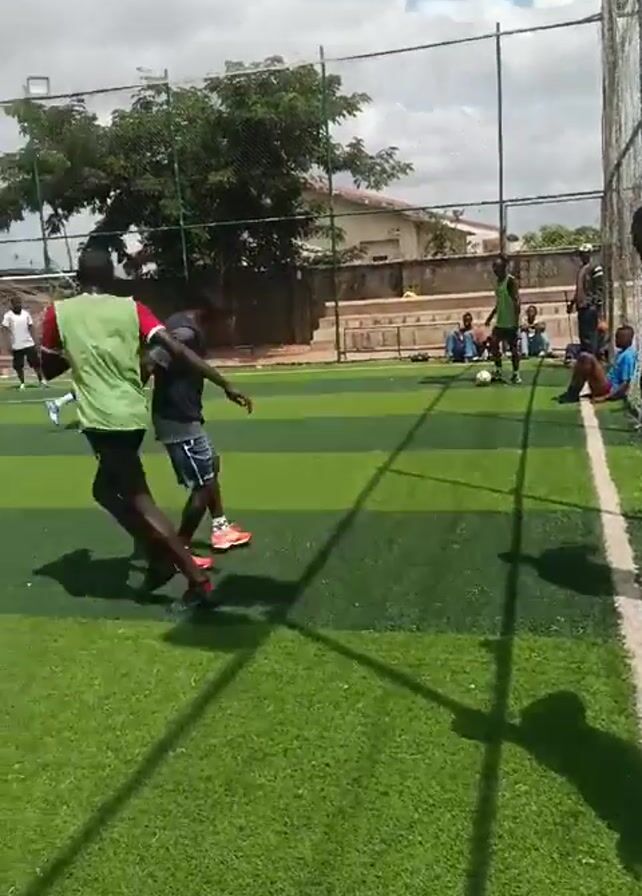 group of young men playing soccer on a fenced artificial turf field. Several players are actively engaged in a soccer match, passing and dribbling the ball. Other individuals are sitting along the sidelines, some of whom are watching the game. The field is marked with white lines and has soccer goals at each end. The surroundings include buildings and trees, with a partly cloudy sky visible above. The video is shot from a static position along the sidelines.