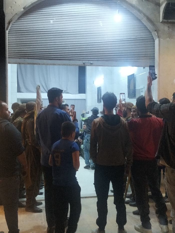 A crowd of approximately 15-20 individuals, predominantly adult males, are gathered at an arched entrance to an illuminated interior space. The setting within the city of Homs, Syria, cannot be precisely identified from the image content alone. In the foreground, individuals are largely seen from behind or profile. Several men are holding smartphones aloft, pointing them into the brightly lit background, indicative of recording video or taking photographs. One young male, seen from the back, wears a blue t-shirt with "LEWANDOWSKI 9" printed in white on the reverse. On the far left, a person wearing darker clothing or a uniform holds an upright, light-colored fabric item, possibly a flag or banner. Other individuals on the left appear to be in military-style attire. The entrance features a partially raised corrugated metal roll-down shutter and is topped by a distinct arch. A bare incandescent light bulb illuminates the immediate entrance area from above. Beyond the entrance, an interior space with light-colored walls and flooring is visible, lit by multiple bright artificial light sources. Dark, rectangular objects, possibly framed pictures or mirrors, are affixed to the far interior wall. The ground in the foreground is a light-colored, flat surface.