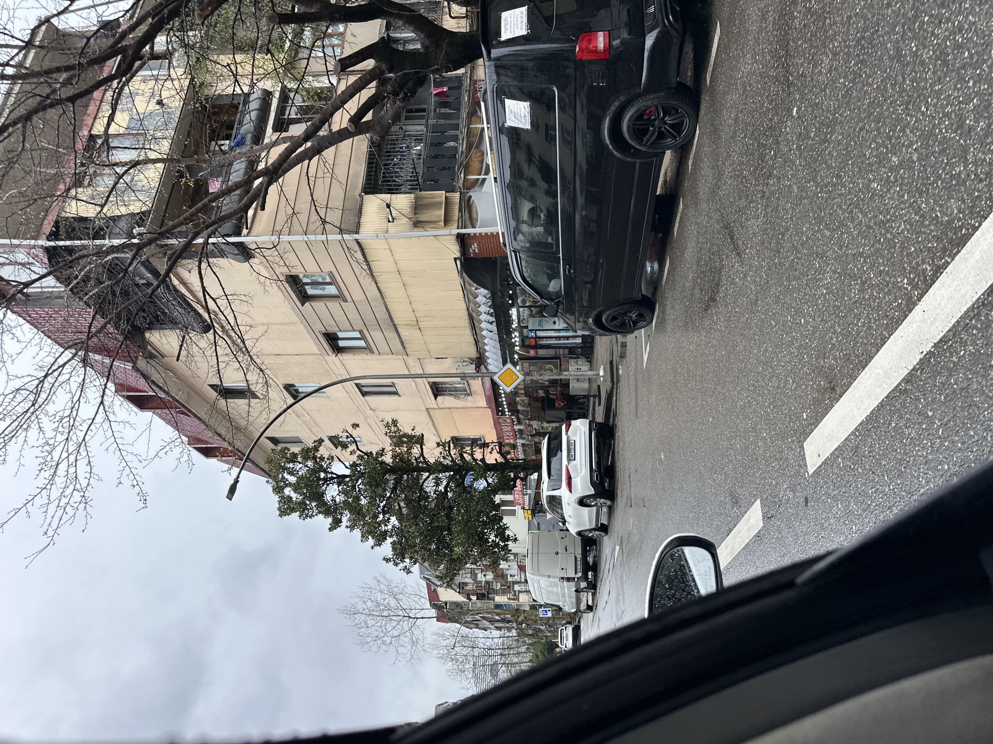 The image, taken from inside a car, shows a street scene in Batumi, Georgia. A black van is parked on the right side of the road, with several white vans parked further down the street. The buildings on the left are multi-story with aged, yellow-toned facades. Bare tree branches are visible in the foreground and along the street, suggesting it might be late autumn or winter. The road appears wet, possibly from rain, and has a white painted line marking the edge. A yellow diamond-shaped road sign is visible near a shop. The overall scene suggests an urban environment on a cloudy day.