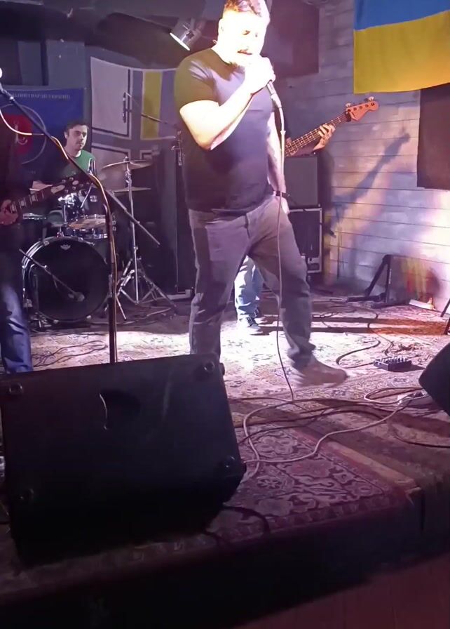 band performing on a small stage. The singer, a man with short brown hair and a mustache wearing a black t-shirt and grey pants, is singing into a microphone. To his left is a bassist, a man with a beard and glasses wearing a black t-shirt and blue jeans, playing a white bass guitar. Behind them is a drummer wearing a green shirt. A Ukrainian flag is visible in the background. The stage is lit with red, blue, and white lights. The floor of the stage is covered with a patterned carpet. Several speakers are positioned in front of the stage.