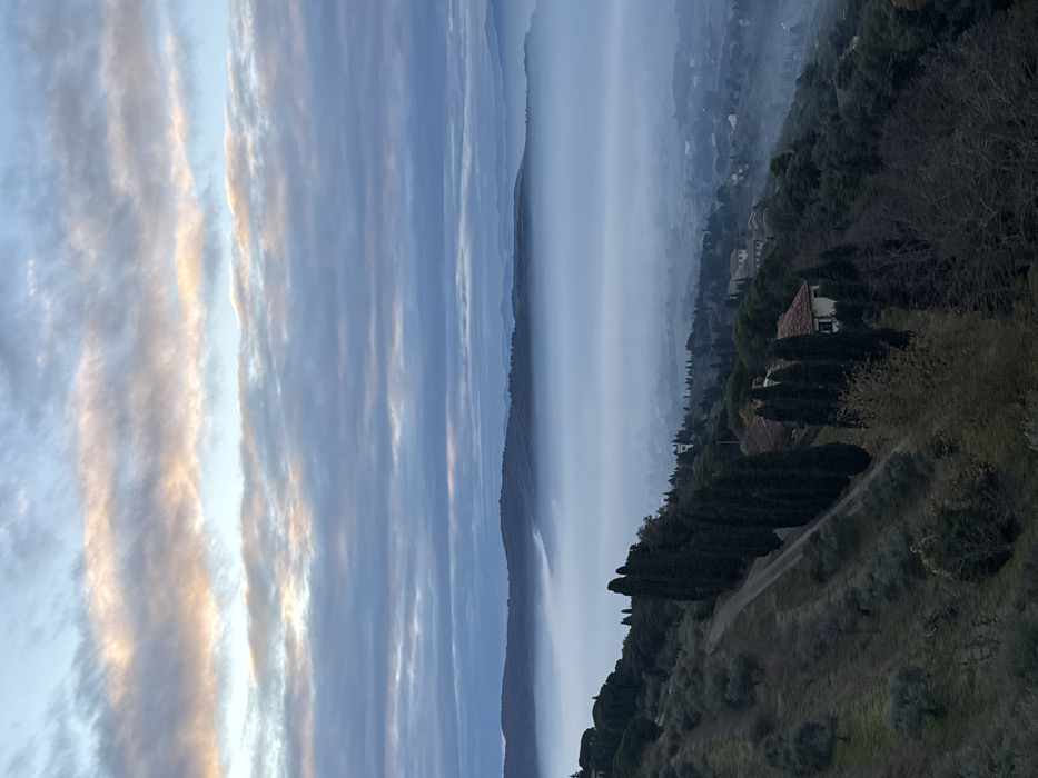 A scenic landscape unfolds under a cloudy sky, with streaks of orange light highlighting the clouds. Mountain ranges stretch into the distance, partially obscured by a layer of fog. The foreground features a hillside with trees, and a dirt path can be seen winding through the vegetation, leading to a building with a reddish roof. The image captures a tranquil and misty atmosphere.