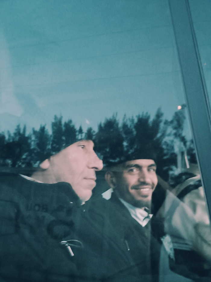 This image depicts two men within a reflection on a pane of glass, set against an outdoor background in Majjate, Morocco