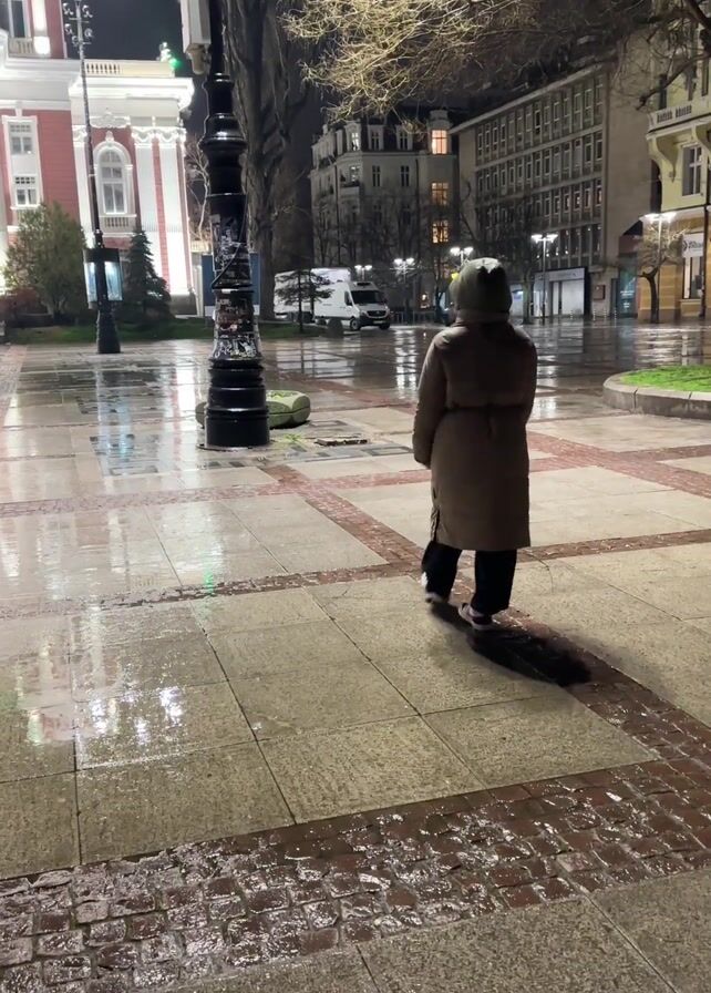 A woman stands on a wet, paved square at night. She is wearing a brown coat, dark pants, and a hat. In the background are buildings and streetlights. She turns and walks a few steps, then turns back to face the camera. The square is wet and reflects the lights. A lamppost is to her left, and a white van is visible in the background.