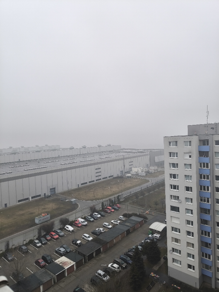 The image displays an urban-industrial scene in the Devínska Nová Ves district of Bratislava, Slovakia, under an overcast, hazy, light-grey sky. In the midground and background, the dominant feature is an extensive industrial complex, identified as a portion of the Volkswagen Slovakia plant. This complex consists of multiple large, interconnected, single-story buildings with light-grey corrugated walls and flat roofs. These roofs are densely covered with numerous circular and rectangular ventilation units. A paved access road parallels the perimeter of this industrial area. In the foreground, occupying the right side of the frame, is a multi-story residential apartment building. The visible section of this structure is primarily light grey, featuring numerous rectangular windows, some of which are accented by light blue paneling. The building's flat roof supports communication antennas and other technical equipment. At ground level, multiple asphalt parking lots are visible. One lot, situated in front of the industrial complex, contains a few scattered passenger vehicles. Another, larger parking area is lined with a series of individual garages constructed from various materials and featuring differing roof styles. This lot is occupied by numerous parked passenger cars of various makes, models, and colors (e.g., white, red, grey, black). A white shipping container, marked "Kühne + Nagel" in red text, is positioned on a concrete base near one of the parking areas. Paved roads and pathways connect the different sections of the ground level, with a white barrier arm visible across one road segment. Sparse, bare deciduous trees and areas of dormant brown grass are present throughout the scene. No individuals are visible, and no dynamic actions or interactions are depicted.