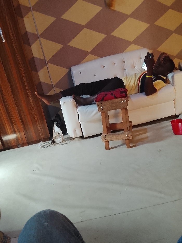 The image depicts an indoor scene in the city of Unknown, Unknown. An adult male of dark complexion is observed reclining horizontally on a white, button-tufted sofa. He is dressed in a yellow polo shirt with dark stripes, black trousers, and a yellow wristband on his right arm. He is barefoot. The male holds a dark-colored smartphone with both hands, its illuminated screen visible, indicating active use. His left leg is extended on the sofa, while his right foot rests on a small, crude wooden stool covered with a red and black patterned cloth. On the light-colored floor to the left of the sofa, a white electric clothes iron with an exposed power cord is present, positioned next to a dark, indistinct object. A bright red plastic bucket sits on the floor to the right of the sofa. The wall behind the sofa features a repeating diamond pattern in alternating light yellow and brown hues. To the far left, a section of dark brown wooden paneling or a cabinet is visible. The immediate foreground shows the knees and upper thighs of a person wearing blue denim jeans, indicating the perspective from which the image was captured.