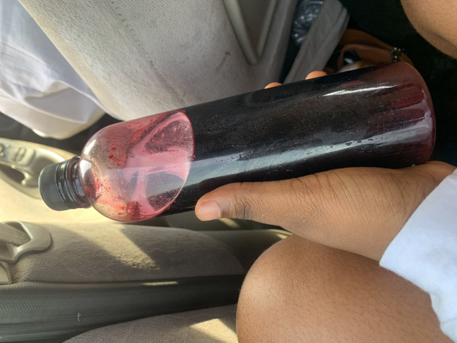 This image depicts an interior scene, specified to be located in Keffi, Nigeria. The primary focus is a dark-skinned right hand holding a transparent plastic bottle topped with a black screw cap. The bottle contains a stratified liquid; the lower portion is dark red-purple, while the upper section shows a brighter crimson-magenta liquid, with droplets clinging to the interior sides. Condensation is visible on the bottle's exterior, suggesting cold contents. To the left of the hand, a portion of a bare, dark-skinned thigh is visible, along with a white fabric cuff or sleeve around the wrist. In the background, to the left, is textured grey or beige upholstery, likely a vehicle seat or interior panel. To the right, partial light-colored clothing of another individual is discernible, along with blurred elements suggesting a vehicle interior. Strong natural light illuminates the scene from the upper right.