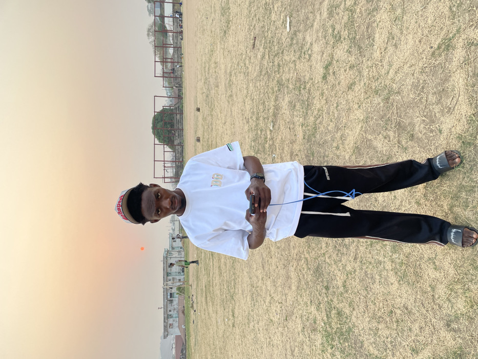 A male individual stands centrally on a dry, patchy grass field in Lokoja, Nigeria, under a hazy, pale orange sky with a visible orange sun disc in the upper left