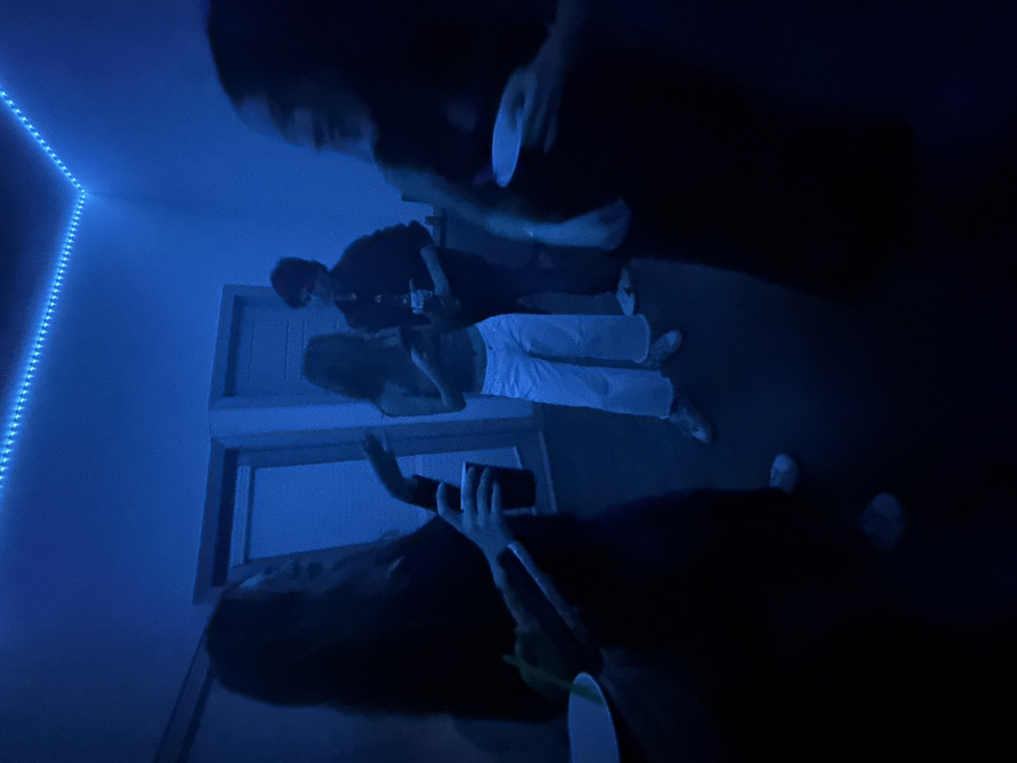 A room with blue lighting contains a group of people. One person in white pants is lying down, and another person in black clothing is sitting and playing the guitar. Two other figures appear, one above them holding a cup and another below holding a phone. A string of lights is visible along the top of the wall, and the room has dark shadows and low lighting.