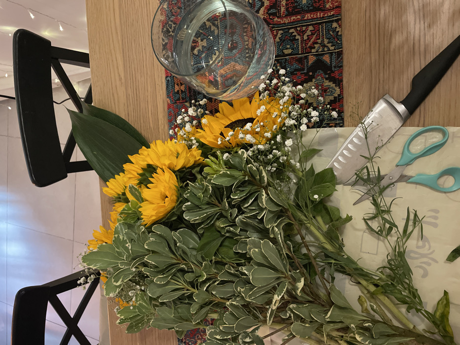 The image depicts a detailed still life focused on floral preparation, set on a light-colored wooden table in an indoor location within Herzliya, Israel. A large quantity of cut flowers and foliage occupies the left and central areas. This includes multiple bright yellow sunflowers, numerous stems of dense green foliage with variegated light-edged leaves, and delicate clusters of small white filler flowers. A single, prominent dark green leaf is also visible among the floral components. To the right of the flowers, a clear, rounded glass vessel containing water rests on a richly patterned textile mat or runner, which displays intricate geometric designs in shades of red, blue, green, and orange. Below the main floral mass, a chef's knife with a silver blade featuring indentations and a black handle is positioned alongside a pair of scissors with teal-colored handles. Both tools are placed on a light, possibly cream-colored, surface or sheet. In the upper background, two dark-colored chairs with cross-back designs are partially visible, situated on a light-tiled floor, with soft, out-of-focus background lights indicating artificial illumination. The overall scene suggests a process of arranging or preparing flowers.