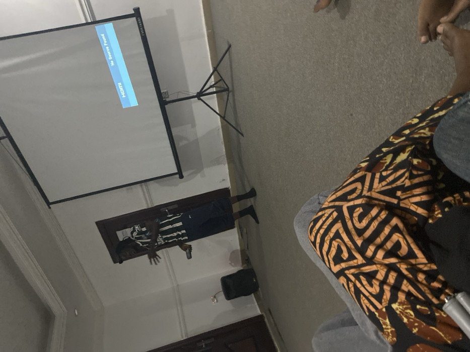 An indoor scene shows a projector screen with an error message. A person stands in front of the screen, possibly giving a presentation. To the side, someone is sitting, wearing patterned pants and jeans. A small black speaker is also present, near a doorway. The room appears to be a meeting space or classroom. Feet are visible near the top of the frame.