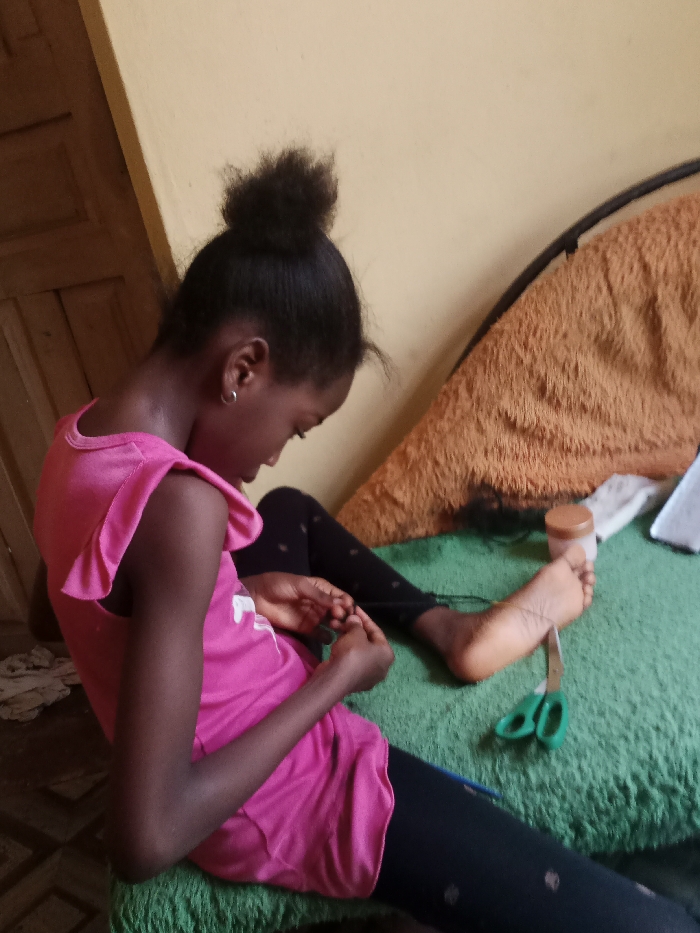 In an indoor setting in Iju, Nigeria, a young female individual with dark skin and dark hair styled in a high bun is seated on a green cushioned surface. She is wearing a pink sleeveless top with ruffled shoulders and black leggings. Her left foot is extended, with a strand of material (likely thread or yarn) looped around her big toe, extending towards a small, cylindrical brown plastic container positioned nearby. Her hands are engaged in manipulating a similar material, consistent with braiding or weaving activity. Green-handled scissors rest on the green surface near her left foot. In the immediate background, a light yellow wall is visible, along with a dark wooden panel or door to the left. To the right, a large, light brown, textured fabric item, possibly a blanket or cushion, is draped over a dark support structure. A piece of white fabric or paper lies near the brown container.