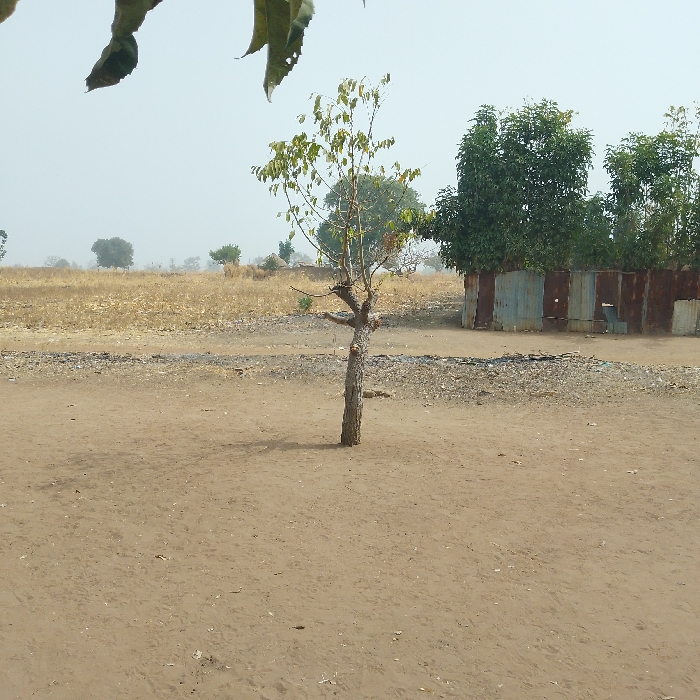 This image depicts an outdoor scene in Sabongari Garkida, Nigeria. The foreground consists of an expanse of compacted, light brown earth. In the midground, slightly left of center, a slender tree with a rough, dark brown trunk and sparse light green foliage stands, casting a faint shadow. Behind the tree, a narrow band of ground is strewn with light-colored debris. To the right, a structure or fence composed of multiple corrugated metal sheets, exhibiting varied states of rust and color (grey, silver, brown), is visible. This metal structure is partially obscured by several dense, dark green trees with full canopies. The background features a large, flat expanse of dry, yellowish-brown terrain, indicative of fields, with several distant trees scattered across the landscape. The sky is hazy and pale, merging indistinctly with the distant horizon. No people or observable actions are present.