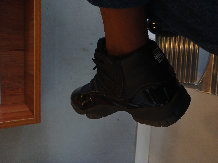 - "person's lower leg and foot, wearing a black leather shoe with a white logo on the side, resting on a metal surface with a striped pattern" by FM-4d4EY2, licensed under CC BY 4.0
