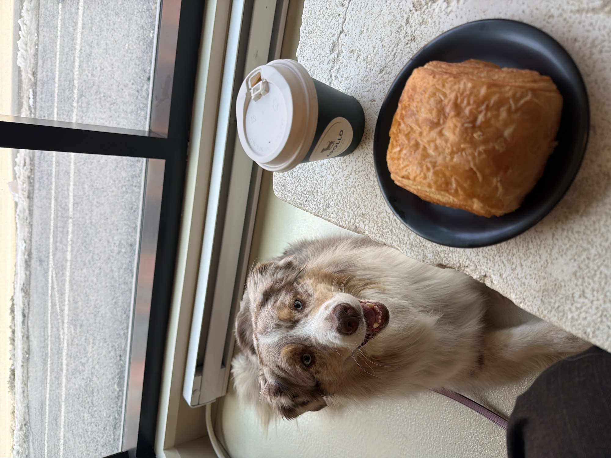 A medium shot from an elevated angle reveals a scene from the interior of a café in Montreal, Canada, likely during winter. Outside the window to the left, a street is visible with traces of snow. A light-colored, textured table is positioned near the window. Upon the table rests a paper coffee cup with a white lid and the logo of "Apollo" and a black plate containing a golden brown pastry. Below these items is a smiling, medium-sized Australian Shepherd dog looking up toward the camera. A leash extends from the dog out of the frame on the bottom right. Part of a dark-colored garment is also visible in the lower right corner of the frame.