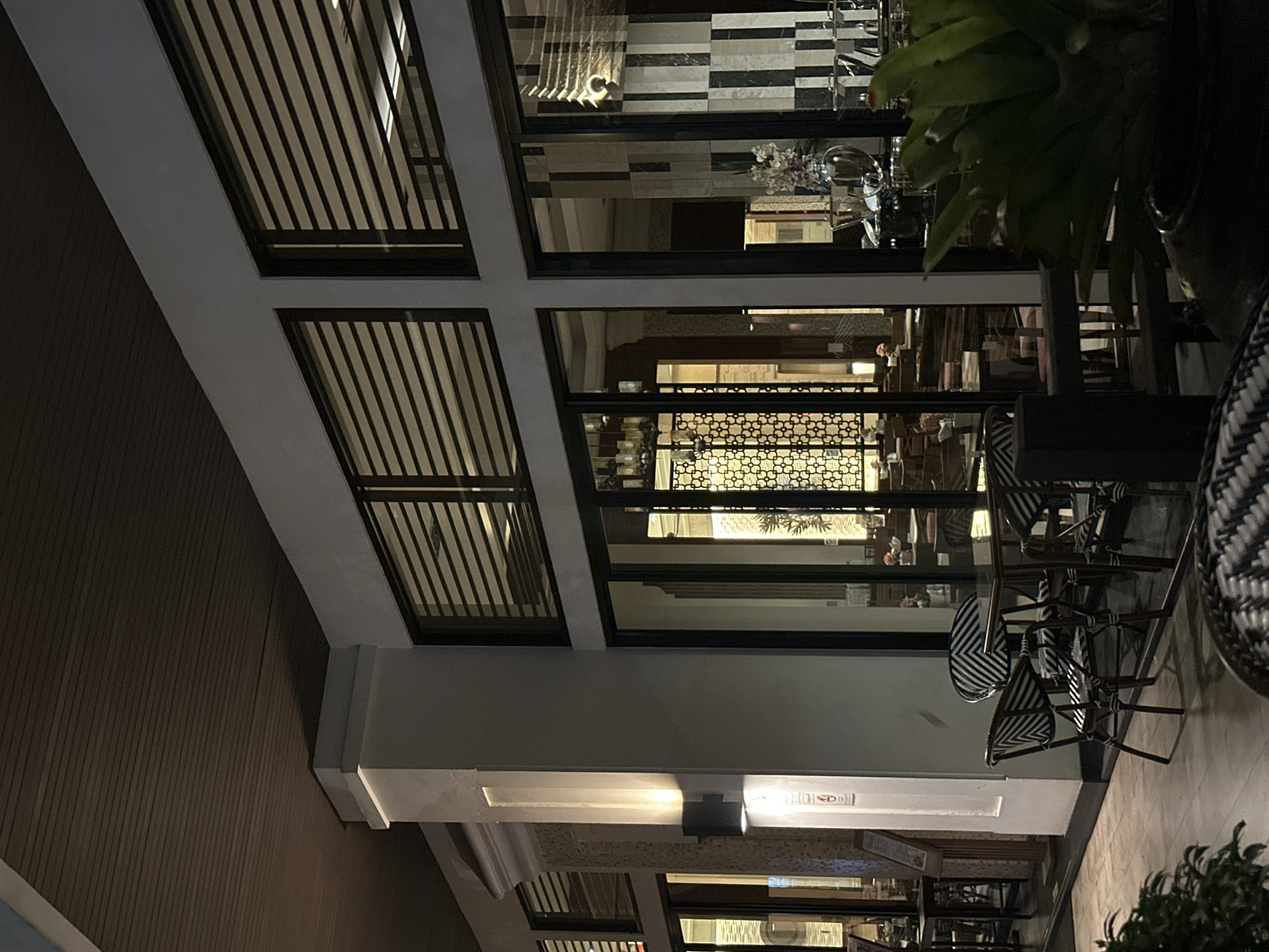 The photograph captures an outdoor dining area in Pattaya City, Thailand, at night. The setting appears to be an upscale restaurant or cafe with a focus on outdoor seating. The architecture features a mix of modern and possibly colonial styles, characterized by large windows with visible interior latticework, suggesting a view into the restaurant. The foreground features several stacked chairs with black and white striped patterns. These chairs are arranged near the edge of the frame, indicating they are part of the outdoor seating arrangement. To the right, there is a large potted plant. The image is taken from a low angle, looking upwards toward the ceiling or upper structure of the building. The light source is dim, with soft lighting.